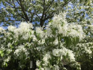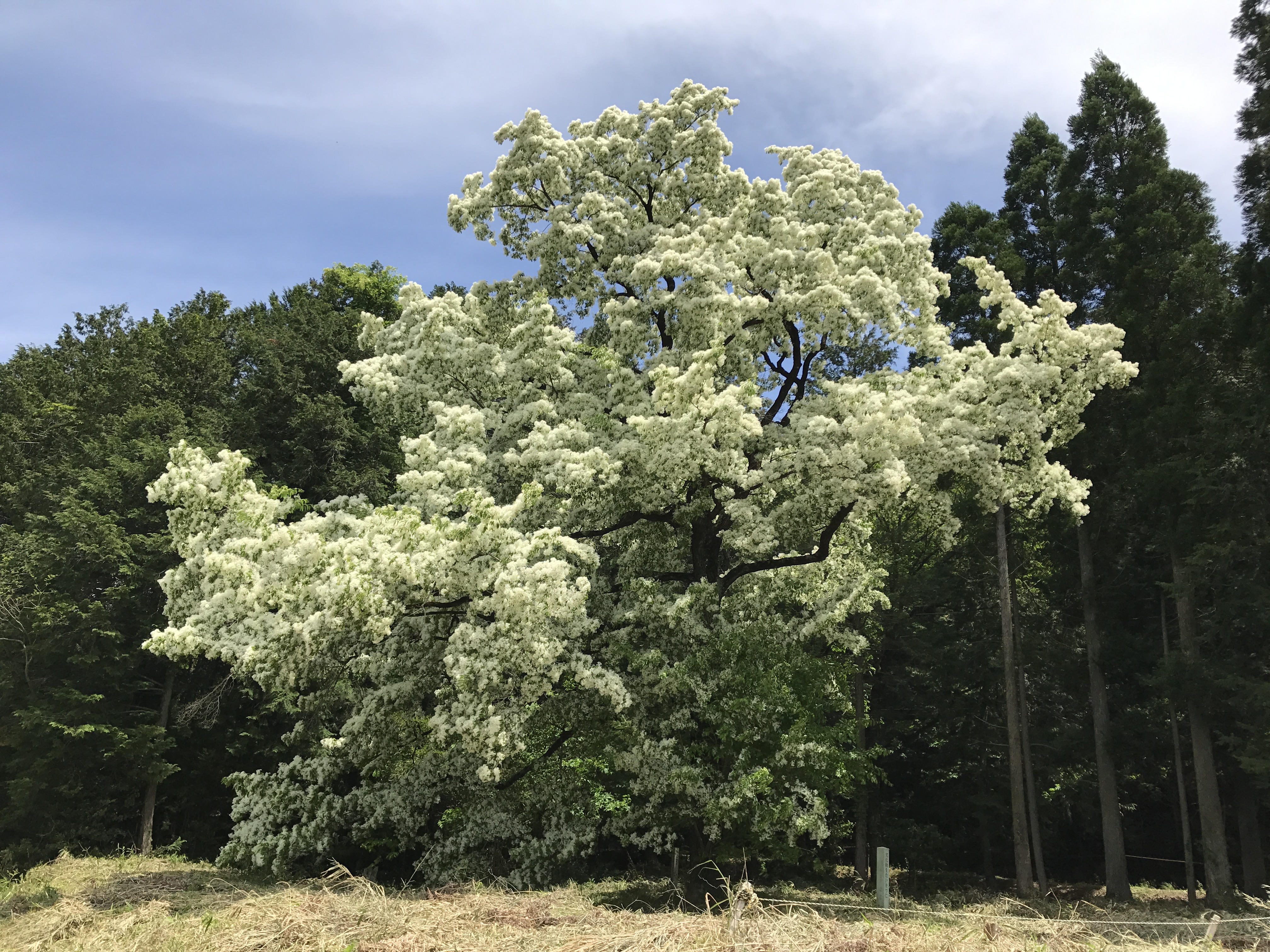 ヒトツバタゴは5月半ばに満開を迎えるモクセイ科の植物です。その姿は、まるで季節外れの雪が降り積もったかのようで、ふわふわの白い花を咲かせます。